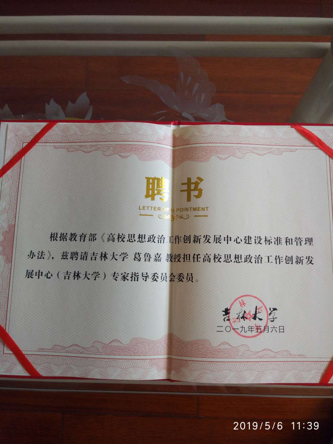 2019年5月6日,吉林大学党委书记杨振斌主持召开了教育部高校思想政治工作创新发展中心专家指导委员会成立暨第一次会议。由教育部成立的该创新发展中心,将聚焦教育部关于高校大学生心理健康教育指导工作的总体部署,充分发挥高校大学生心理健康教育指导工作创新发展的“思想库”作用。会议选举产生了由国内著名心理学专家所组成的专家指导委员会的机构,并颁发了聘任证书,聘期四年。吉林大学党委书记杨振斌研究员担任中心专家指导委员会主任,吉林大学党委副书记冯正玉研究员和清华大学李焰教授担任副主任,北京师范大学方晓义教授,中国科学技术大学孔燕教授,中山大学李桦教授,中国人民大学俞国良教授,北京理工大学贾晓明教授,吉林大学葛鲁嘉教授,担任专家委员。