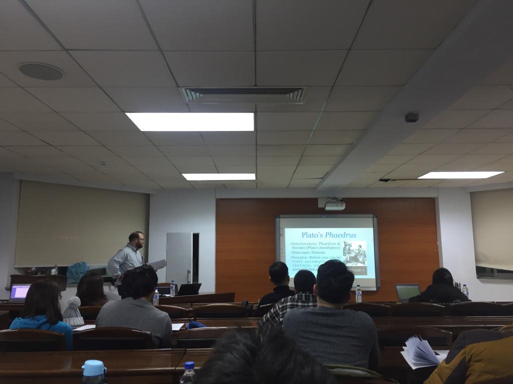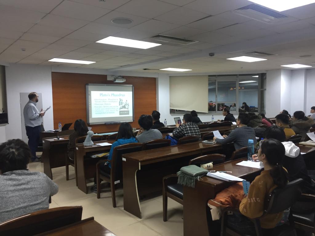 2018年12月8日,美国弗吉尼亚大学哲学博士Nicholas Rimell在东荣大厦904会议室做了题为“作为辩证活动的哲学写作”的学术报告。哲学社会学院部分师生前来聆听了此次讲座。本讲座由哲学系曲红梅教授主持,讲座以英语进行。