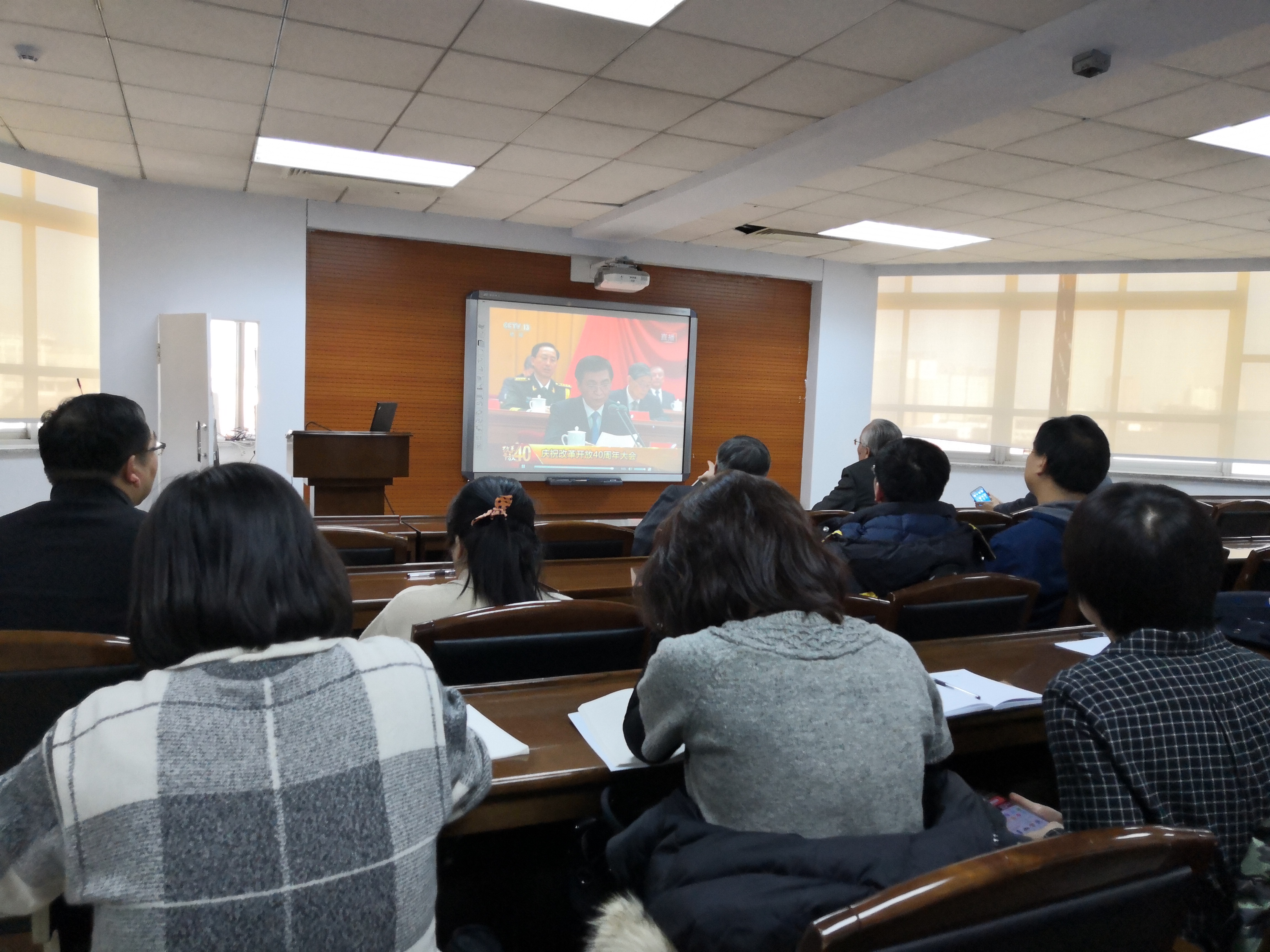 12月18日上午10点,庆祝改革开放40周年大会在北京人民大会堂隆重举行。哲学社会学院党委组织教职工,在东荣904会议室,全程收看了庆祝改革开放40周年大会直播。吉林大学资深教授、哲学基础理论中心主任孙正聿教授,哲学社会学院院长、田毅鹏教授、哲学社会学院党委书记全华老师和全体理论中心组成员同学院教职工共同观看直播盛况。
