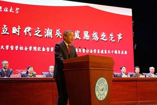 中国工程院院士、吉林大学校长李元元教授发表了热情洋溢的大会致辞。李元元校长首先代表学校党政领导和全体教职员工,向哲学学科和社会学学科全体师生及海内外校友表示热烈的祝贺!向前来参加庆祝活动的各位领导、来宾表示诚挚的欢迎!向为两个学科建设发展作出杰出贡献的师生员工和给予关怀帮助的各级领导、社会各界人士及广大校友致以崇高的敬意和衷心的感谢!李校长指出:以刘丹岩、高清海、舒炜光教授为代表的老一辈学术群体以其独立之精神、自由之思想,本着对民族命运强烈的忧患意识和责任感,率先在中国哲学界展开哲学体系改革与哲学观念变革。他们所表现出来的追求真理的勇气、理想主义的情怀和自由批判的精神对吉林大学整个人文社会科学的学术风骨产生了深远的影响!以哲学学科孙正聿、孙利天、贺来和社会学学科邴正、田毅鹏等教授为代表的新一代学术带头人,在老一辈学术巨匠奠定的学术基础上,形成了自己独具特色的研究纲领,他们所带领的团队受到了国内外同行的认可和尊重,也使我校哲学社会学院成为当今中国哲学界和社会学界最有影响力的学术重镇之一,为我国的哲学和社会学事业作出了重要贡献。李元元校长表示,学校将一如既往、不遗余力地推动、支持哲学和社会学的发展。衷心希望哲学和社会学学科能以习近平新时代中国特色社会主义思想为指导,以建设世界一流学科为目标,以塑造和引导新的时代精神为理论使命,将研究方向聚焦于马克思的哲学变革与哲学理念创新、当代中国马克思主义与中国道路、政治哲学与制度文明建构、人类文明新形态的哲学理念等重大的哲学基础理论问题,引领当代中国的哲学基础理论研究,为中国特色社会主义的伟大实践提供具有原创性的哲学思想。希望全院师生团结一致、奋力拼搏,增强学科发展核心竞争力,拓展国内外交流与合作,早日建成具有中国特色、世界水平、吉大特点的一流学科。