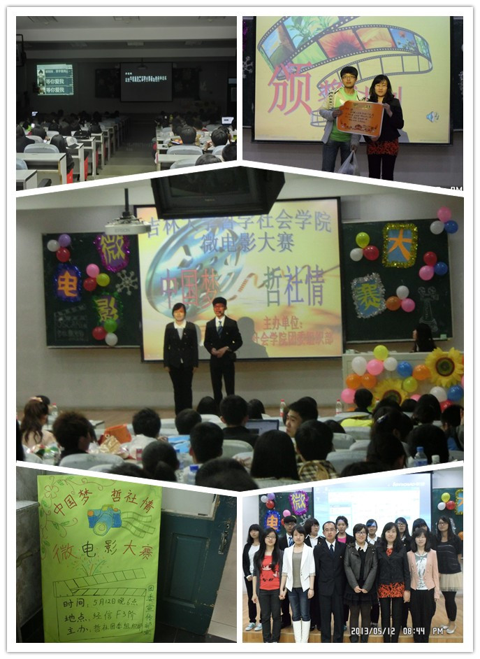 “电影小拍哲社情,银幕宽显中国梦”。为增强哲学社会学院青年学子的社会责任感和历史使命感,鼓励学生树立正确人生目标,共筑中国梦,哲学社会学院团委组织部于2013年5月12日晚6点在经信F3阶举办了以“中国梦·哲社情”为主题的微电影大赛。哲学社会学院党委副书记兼副院长朱丽雅老师、辅导员张洁老师,以及团委的主要学生干部出席了本次活动并担任评委。