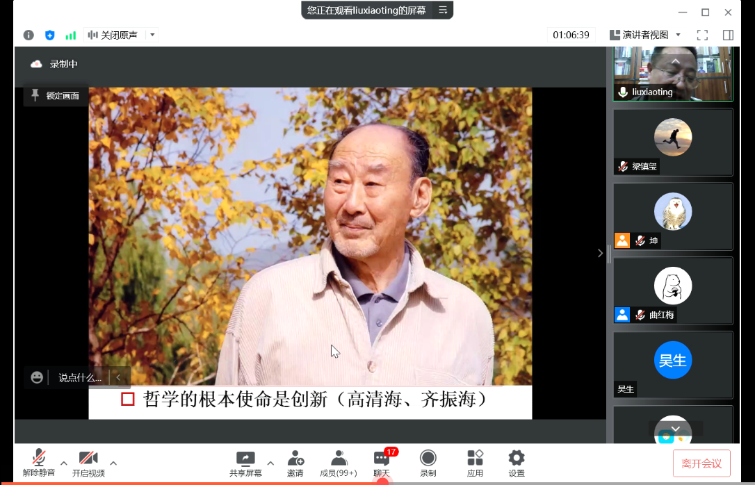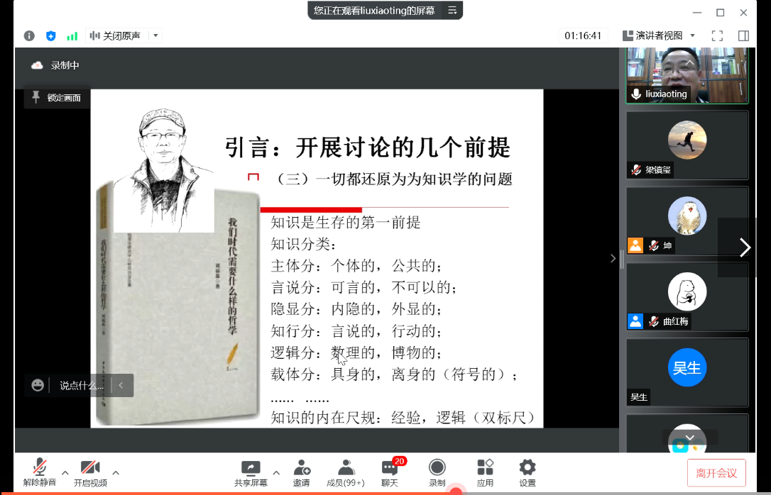 2022年04月06日19时,我院“2022年吉林大学哲学社会学院学术教育提升工程”系列讲座的首讲依托“腾讯会议”线上平台开展。本期讲座的主题为“漫议哲学和哲学家”,主讲人为北京师范大学哲学学院刘孝廷教授,主持人为我院曲红梅教授。