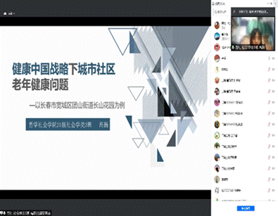 接下来,由哲学社会学院2021级社会学类的三位同学分别介绍健康中国战略的相关内容。金渤同学聚焦社会学视野下老年病凸显、医疗资源城乡差异、基层社区最后一公里的健康治理等的健康命题,从学科角度强调从居民组织化、健康服务提供主体多元化、社会主义医疗福利传统等方面促进健康中国战略;高扬同学结合吉林大学社会学系团队于2020年在长春市宽城区长山花园社区开展的中国人口与发展研究中心健康老龄化项目案例,阐释了社会学专业针对城市社区的孤寡、空巢、失独、失智老人,能够通过链接医疗社会资源在健康管理和照料方面发挥重要作用;刘奕鎏同学以农村慢性病患者的多元社会角色和道德责任出发,强调农村慢性病管理是一个复杂的社会文化问题,除了医学角度,需要从整体性和综合的角度进行深入思考。三位同学从社会学的专业知识出发,为医学与人文社会科学交叉的交流活动提供了思路。