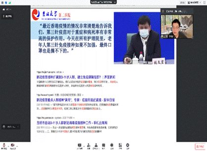 在六位同学的汇报之后,吉大二院秦彦国院长一一进行点评,肯定了他们讲述的专业性和现实意义,并且希望两个学院之间能够通过学科交叉的社会实践活动增加互动,为了健康的目标共同努力。此外,秦院长以《点滴微光,可成星星海》为题,结合自身经历为大家综合讲述了新冠疫情的科学防护。2020年,吉林大学第二医院作为第三批援鄂医疗队出征武汉,取得了很大成果,这与每一位医务人员的努力是分不开的。他还强调医护人员为患者带去了生的希望,让他们“拨开云雾见月明”,这与本次交流会的主题相呼应,也向大家讲述了医者的意义。
