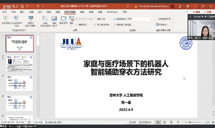 在第三环节,吉林大学人工智能学院助理教授的高一星老师作了家庭与医疗场景下的机器人智能辅助穿衣方法研究的分享,向大家介绍了几种机器人及其应用场所,重点对家庭与医疗场景下的机器人智能辅助穿衣方法进行介绍。高老师特别强调在疫情中,专家们也创造出了例如消毒机器人、咽拭子采样机器人等用来保护医务工作者的安全。这一应用体现出人工智能在医学专业的应用,也将进一步促进两个学科之间的交叉与融合。在高老师的汇报之后,两个学院的同学也积极向老师提出问题,例如人工智能能否在一定程度上代替医生问诊,得到了高老师的耐心解答。