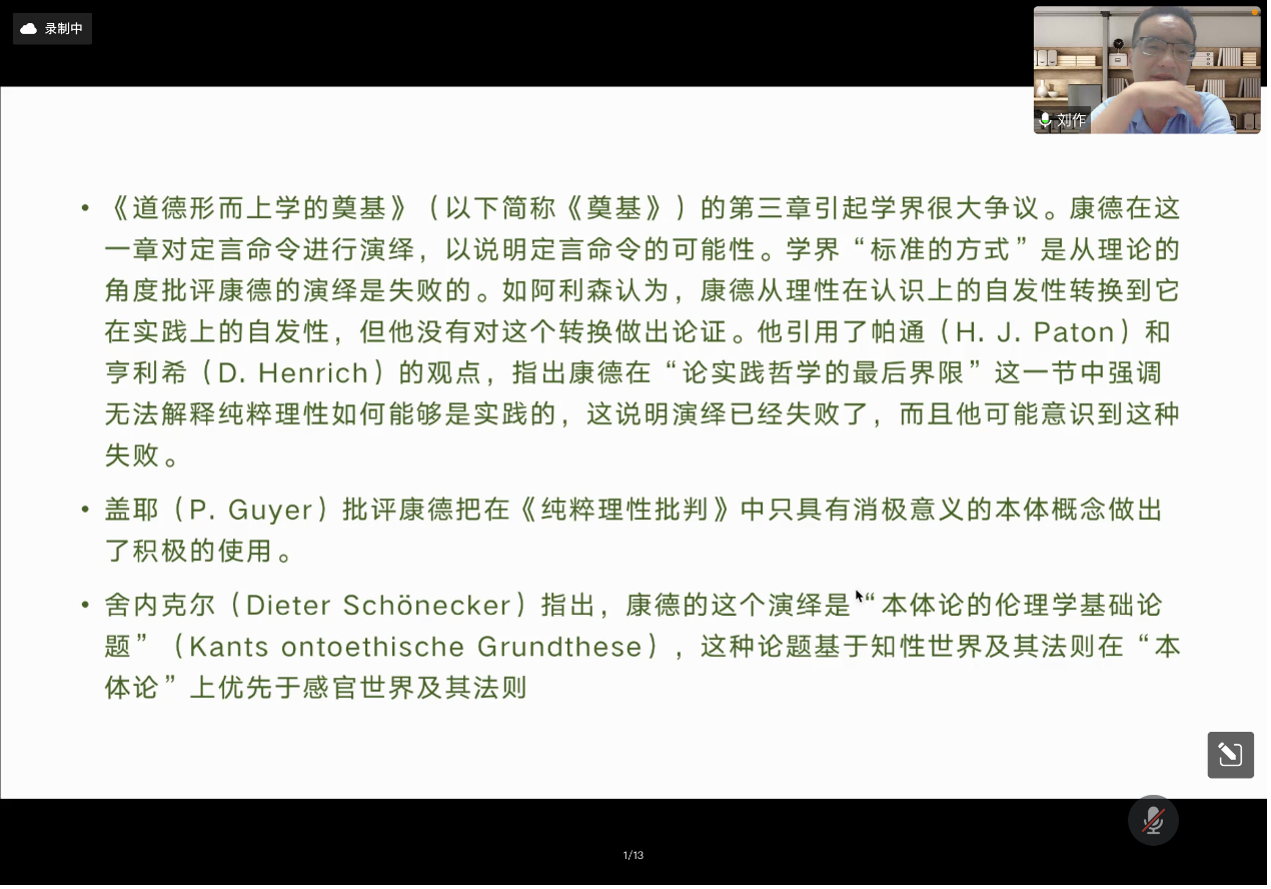 2022年04月13日19时,我院“2022年吉林大学哲学社会学院学术教育提升工程”系列讲座的第二讲依托“腾讯会议”线上平台开展。本期讲座的主题为“如何进入哲学家的文本中的概念世界——以康德《道德形而上学的奠基》定言命令演绎为例”,主讲人为中山大学哲学系刘作副教授,主持人为我院曲红梅教授。