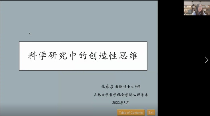 2022年5月13日19时,我院“2022年吉林大学哲学社会学院学术教育提升工程”系列讲座第七讲依托“腾讯会议”线上平台开展。本期讲座的主题为“科学研究中的创造性思维”,主讲人为吉林大学哲学社会学院心理学系张彦彦教授。我院心理学系副主任金庆英副教授主持讲座,哲学社会学院曲红梅教授参加了讲座。