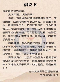 疫情突袭吉林大地,校园实行封闭管理。3月11日,我校升级并启动应急响应。吉林大学的青年学子踊跃报名参加战疫志愿工作,我院2019级本科生、吉林大学青马学员刘奔腾第一时间连夜起草倡议书,于3月12日号召青马学员走上校园疫情防控第一线,充分发挥青马学员的先锋带头作用。在他的号召下,全体青马学员积极响应号召,共计115名不同专业、不同年级、不同校区的青马学员加入了吉大抗疫一线志愿者的队伍。他的这一行动还受到了人民日报、新华社等媒体的关注和报道,让他倍感荣幸的同时心中更增添了一份责任与担当。