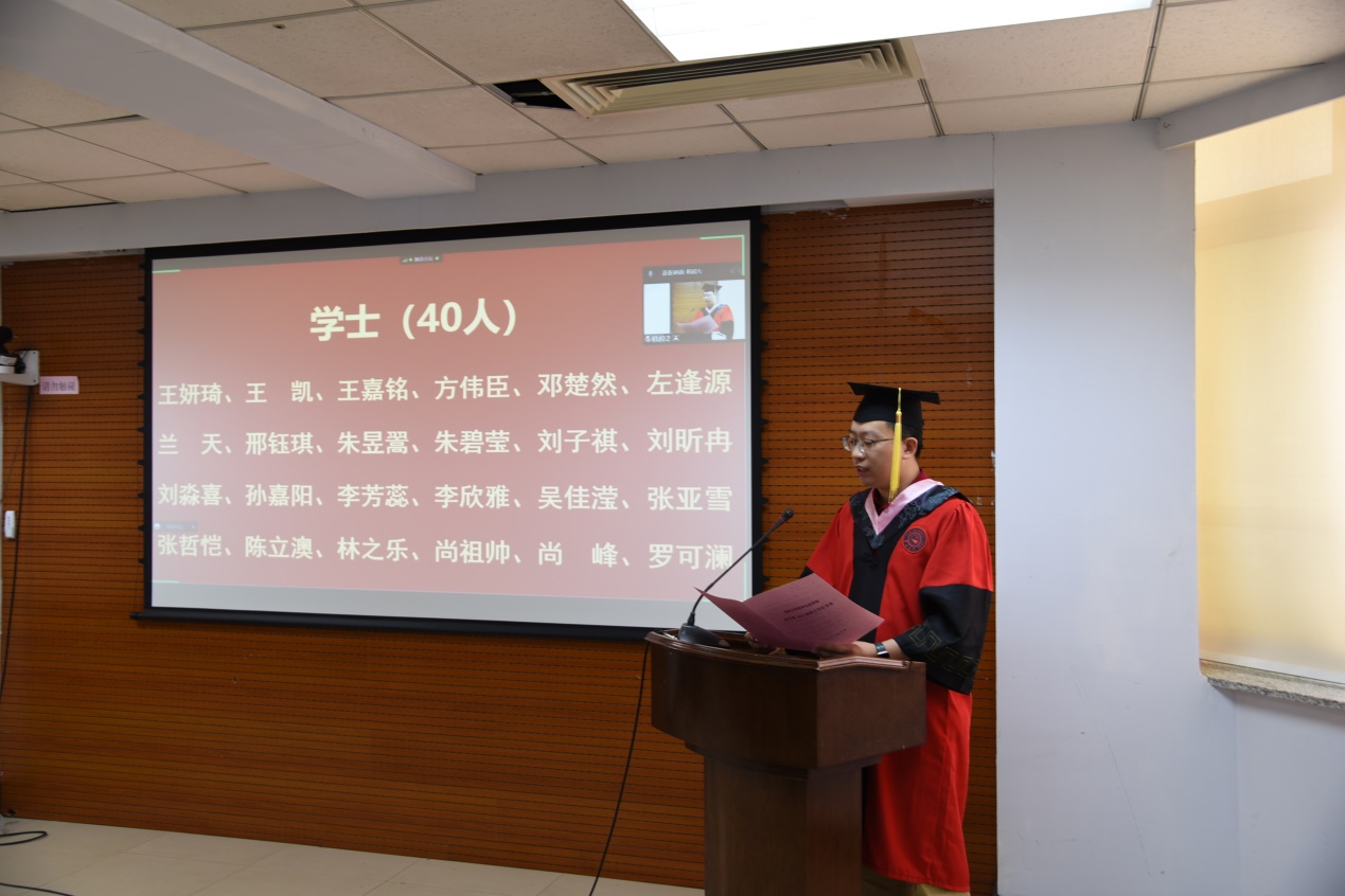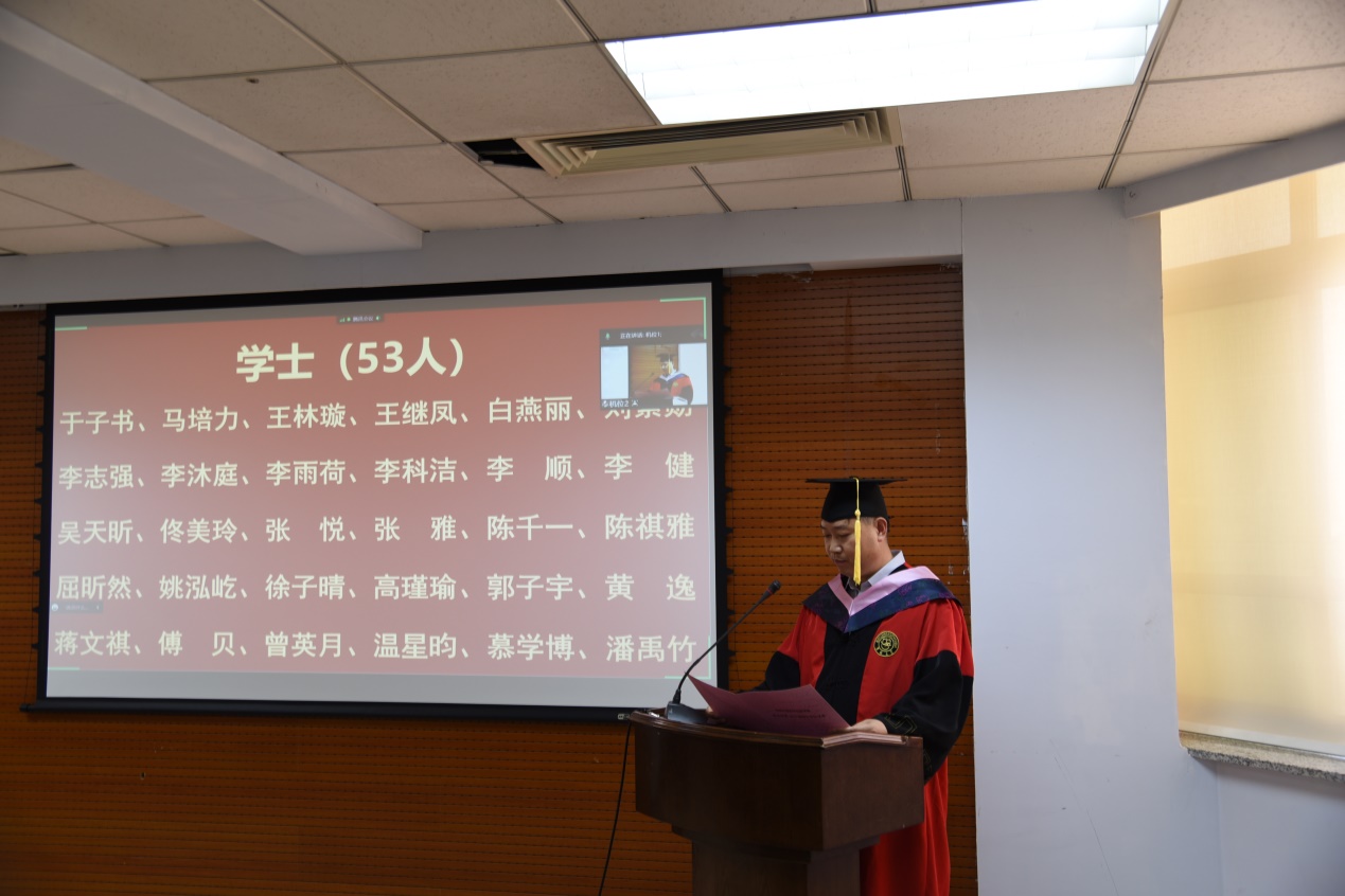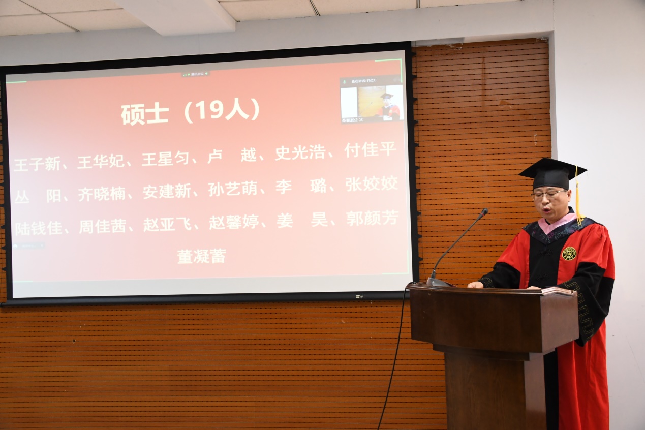 哲学社会学院院长田毅鹏、党委副书记赵洁、党委副书记兼副院长刘培强、副院长曲红梅、副院长芦恒、副院长王福生、哲学系副系主任高超、社会学系主任董运生、心理学系主任张彦彦、劳动与社会保障系主任董才生、学院教师代表社会学系教工党支部书记吴海琳,以及部分毕业生代表现场参加了典礼。同时,部分教师、全体毕业生通过线上会议的方式参加了典礼。典礼由学院党委副书记兼副院长刘培强主持。