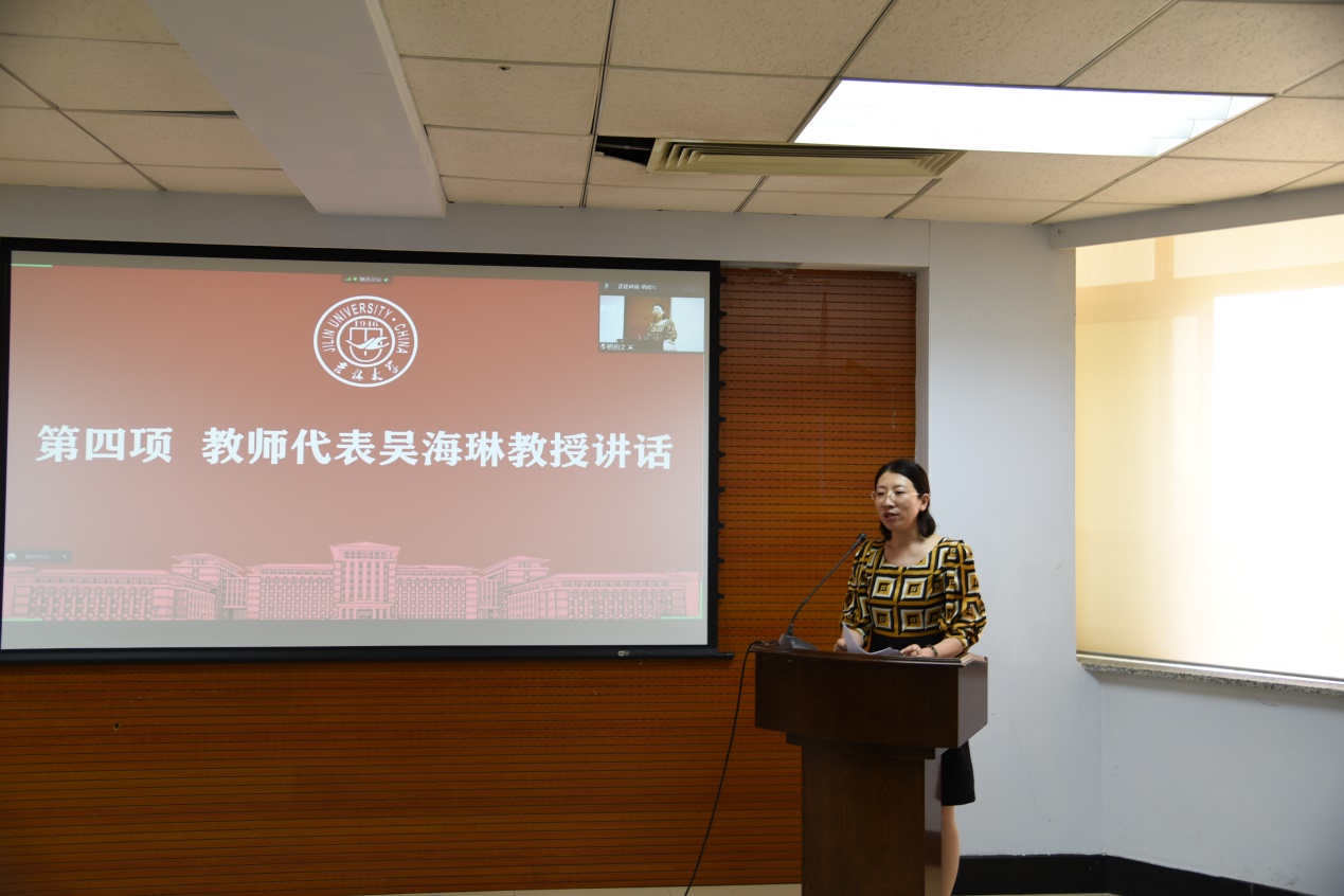 典礼第四项,教师代表吴海琳老师讲话。吴老师谈到,希望学生们用专长武装自己;在心中种下种下梦想的种子;广交朋友,留下永远的财富;修炼通达的性情,接受自己的不完美,不断挑战自我、超越自我,牢牢记住哲学的慎思明辨、社会学大类的担当、心理学对生命质量的关注,向前看到希望,向后留下回忆。心中向阳,眼底有光,成为自己想去成为的人。