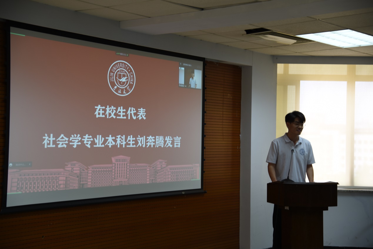 接着,毕业本科生代表刘昕冉同学发言。他提到,身为人文社科领域的学生,务必做到“为人为学,其道一也”,作为迈向学术殿堂、走出境域国门、步入社会职场的毕业生,只要用心浇灌,这片土地上终会树冠成荫、硕果充盈,也会发现自己眼眸清澈、内心有光,终能抵达各自心中的彼方。