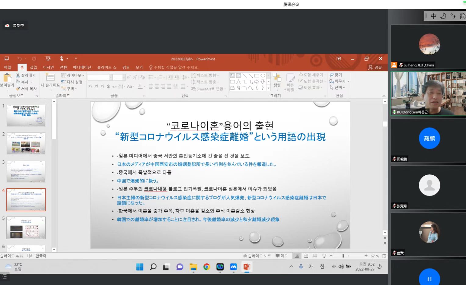 会议第一阶段主题为疫情期间东亚社会转型。韩国国立釜庆大学中国学系系主任芮东根教授在其题为《通过中日韩的“新冠肺炎离婚”来检验疾病,代际和城市》的发言中,以“新冠疫情离婚”为切入点,分析中国、韩国和日本的特大城市与中小城市在疫情期间的离婚率,揭示出东亚在疫情期间体现出的社会文化变迁情况。韩国国立首尔大学社会学系博士生Cho Ha-young在其题为《从地方认同到融合:疫情期间我们能是谁?》发言中认为,疫情加剧了人们对流动人口的羞辱和歧视。随着封锁的延长,仇外心理的风险增加,使外来劳工等移动人口的健康和医疗服务处于较低地位。在新冠疫情加剧流动人口污名化背景下,她探讨了外国移民人口从地方认同转变到融合认同的过程。我院社会学系讲师边清音在《疫情期间日本神户唐人街青年网络空间的自我表达》发言中,以日本神户唐人街年轻人的网络实践为例,探讨其在新冠肺炎期间如何在网络空间中进行自我表达,认为网络空间已经成为个人多元自我表现的重要方式。
