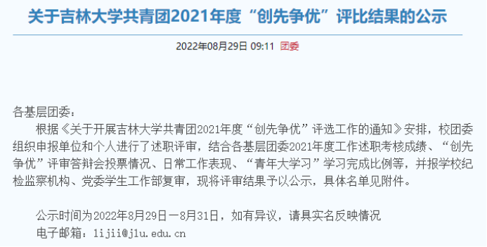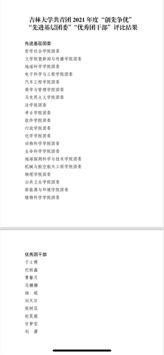 在吉林大学共青团2021年度“创先争优”评选工作中,哲学社会学院团委脱颖而出,荣获“吉林大学先进基层团委”;学院团委书记于士博老师获得“吉林大学优秀团干部”荣誉称号(十佳)。