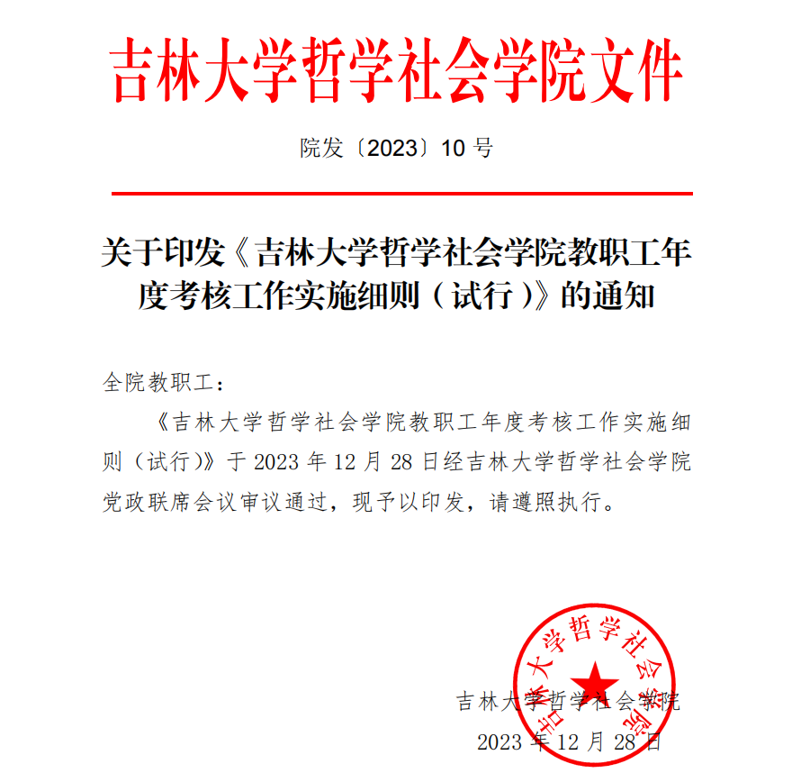 院发〔2023〕10 号关于印发《吉林大学哲学社会学院教职工年度考核工作实施细则(试行)》的通知