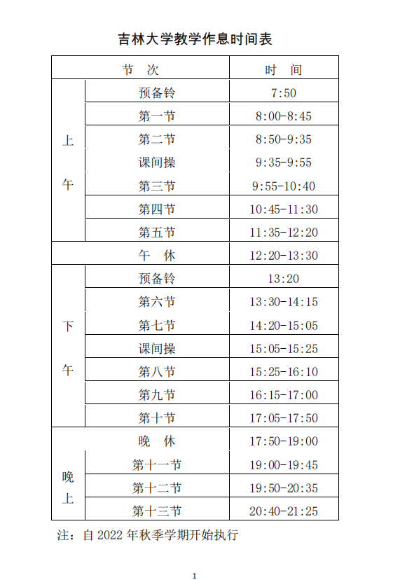 为更好地保障教学秩序,优化学生课程安排、提高教学资源使用效率,经吉林大学2022年第二次校长办公会审议通过,对我校教学作息时间做出调整,现予以公布(见附件)。