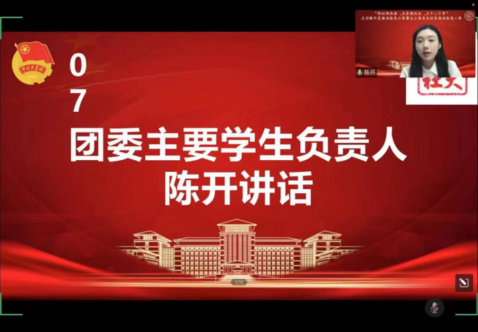 大会第七项,由团委主要学生负责人陈开发表讲话。陈开同学首先代表哲学社会学院团委对本季团校的顺利举办表示祝贺,并对哲学社会学院团校的过往发展、开设内容以及思想引领作用做了详细介绍。同时,她对同学们提出了三点要求:一是要紧跟新时代发展主潮流,用思想引领把握方向;二是要尽显青年一代责任担当,用实践引领增强本领;三是要着力深化理论学习教育,用知识引领武装头脑。