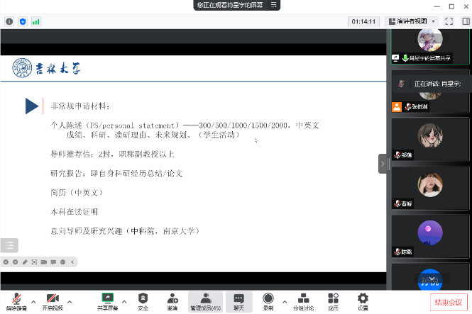 嘉宾介绍后进入主要的经验分享环节。首先邹蕴师姐从总体上讲述了保研的前期条件,分享了“直博准备”以及“吉大推免”经验,鼓励同学们尽早选择,尽早决定。