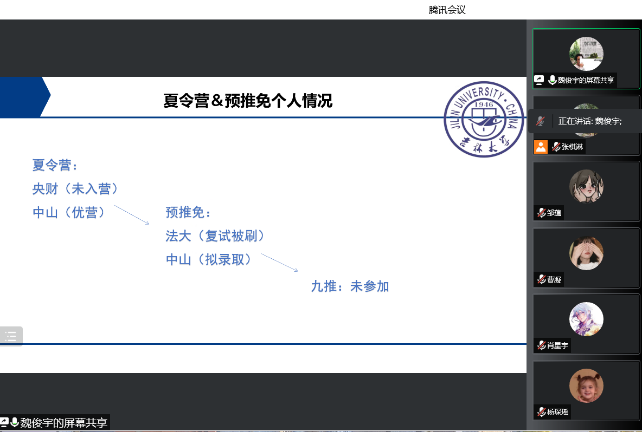 最后出场的魏俊宇师兄的分享很有针对性的、很有特色的,是融入了个人特点的经验分享。实用的专业课复习的技巧、独特的保研经历、特殊的研究方向,坦诚地承认自己的不足,认真地深耕自己地长处,长善救失是师兄传授给我们的不二法门。