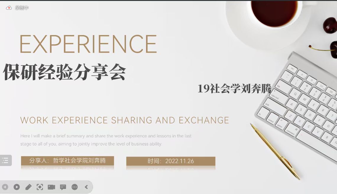 社会工作专业的赵曼彤师姐强调了绩点、外语、阅读、科研等在保研前期准备的重要性,并从回答礼仪、着装仪表、环境设备、回答思路等角度对面试给出了建议。在最后,师姐贴心地鼓励同学放平心态,积极面对保研过程中的各种挫折,学会和失败和解,接纳不够完美的自己。