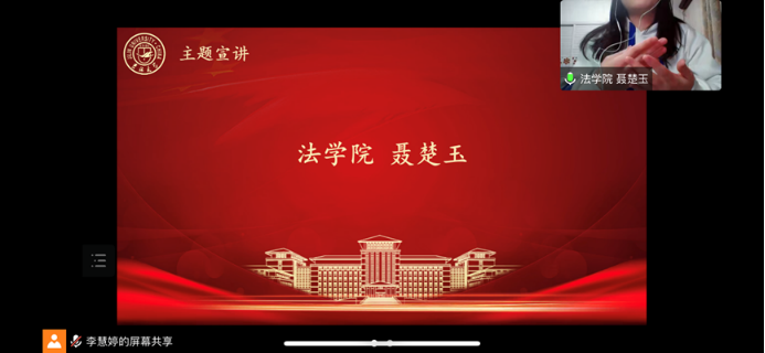 法学院的聂楚玉同学从专业角度出发,介绍了其在《习近平用典·法治篇》的心得体会。中国要构建法治社会就先要解释法治是什么,而解决这个问题既要从时间维度来思考,也要从空间维度来思考。中国传统的官僚法,西方现代法律体系,在新时代的中国面前都有其优劣。这启示我们既不能愚昧套用,也不能盲目抵制。面对古今中外、东西差异的复杂情况,《习近平用典》中则借用一句句典故为我们展现融合之法,既包含“立善法于天下”,又包含“人之初,性本善”,从而在我国的特色法治之路上做到“洋为中用,古为今用”,构建更加美好的法治社会。