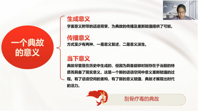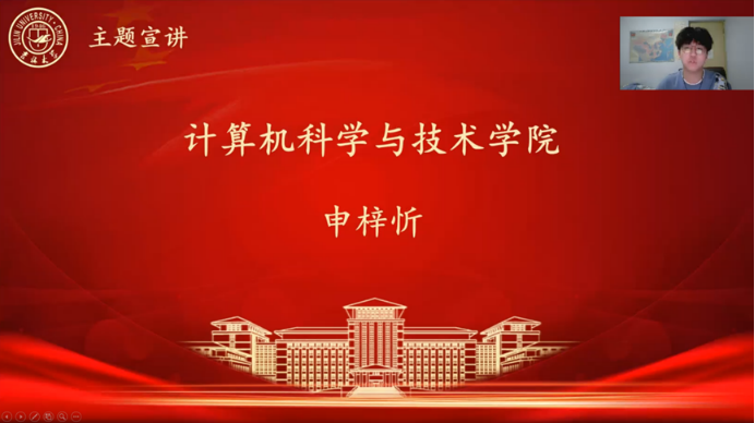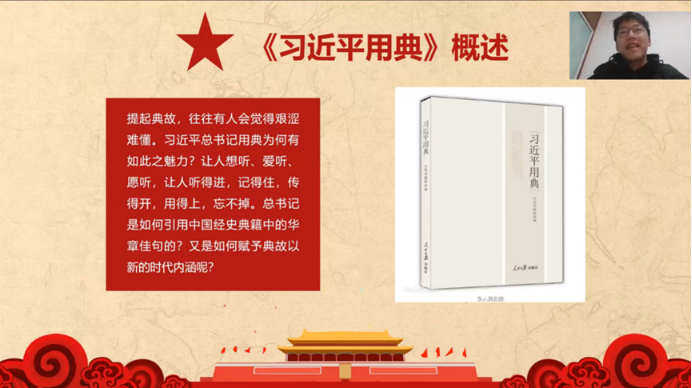 公共外交学院的李书豪同学通过梳理阅读内容介绍了习近平总书记在外交、政治、学习方面运用典故的例子:从世界层面着力构建人类命运共同体,从国家层面坚持立党为公、执政为民,既有“登高望远”的豪情,也有“为山酒仞”的压力,提高为政能力,为天下万民谋福利;同时,寄语当代青年,要立鸿鹄志、做奋斗者,培养奋斗精神,在激情奋斗中绽放青春光芒!