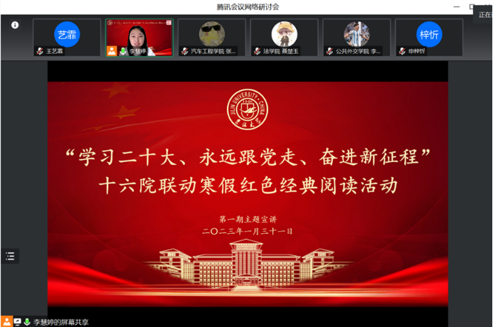 2023年1月31日晚六点,寒假红色经典阅读活动第一期如期举行。来自哲学社会学院、计算机科学与技术学院、人工智能学院、公共外交学院、法学院、汽车工程学院的六位主讲同学分别讲述了自己的读书心得。本次读书会由哲学社会学院李慧婷同学主持。