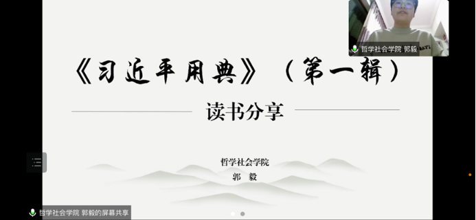 “莫见乎隐,莫隐乎微,故君子慎其独也。”来自哲学社会学院的郭毅同学向与会同学们介绍了阅读书籍中最打动她的三句名言,她感受到这每一个典故既富有其独特的韵味与乐趣,又富有深刻的内涵,指导着我们日常生活的方方面面。同时,郭毅同学鼓励大家在阅读时巧用图例,善做笔记,让抽象的知识变得清晰可见,有序回顾,定期复习,提高读书效率,认真领悟《习近平用典》一书中的经典语句和段落。