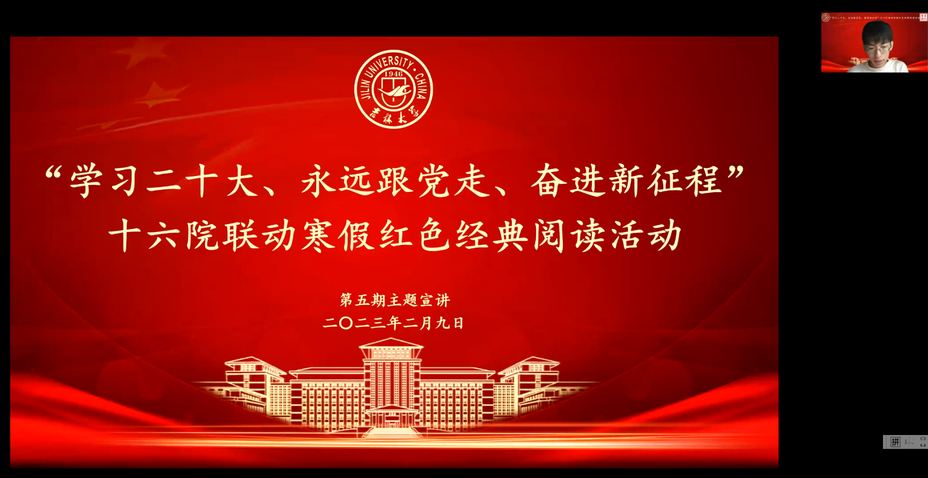 2023年2月9日晚六点,寒假红色经典阅读活动第五期如期举行。来自马克思主义学院、行政学院、人工智能学院、地球科学学院、计算机科学与技术学院的五名主讲同学分别讲述了自己的读书心得。本次读书会由哲学社会学院任睿哲同学主持。