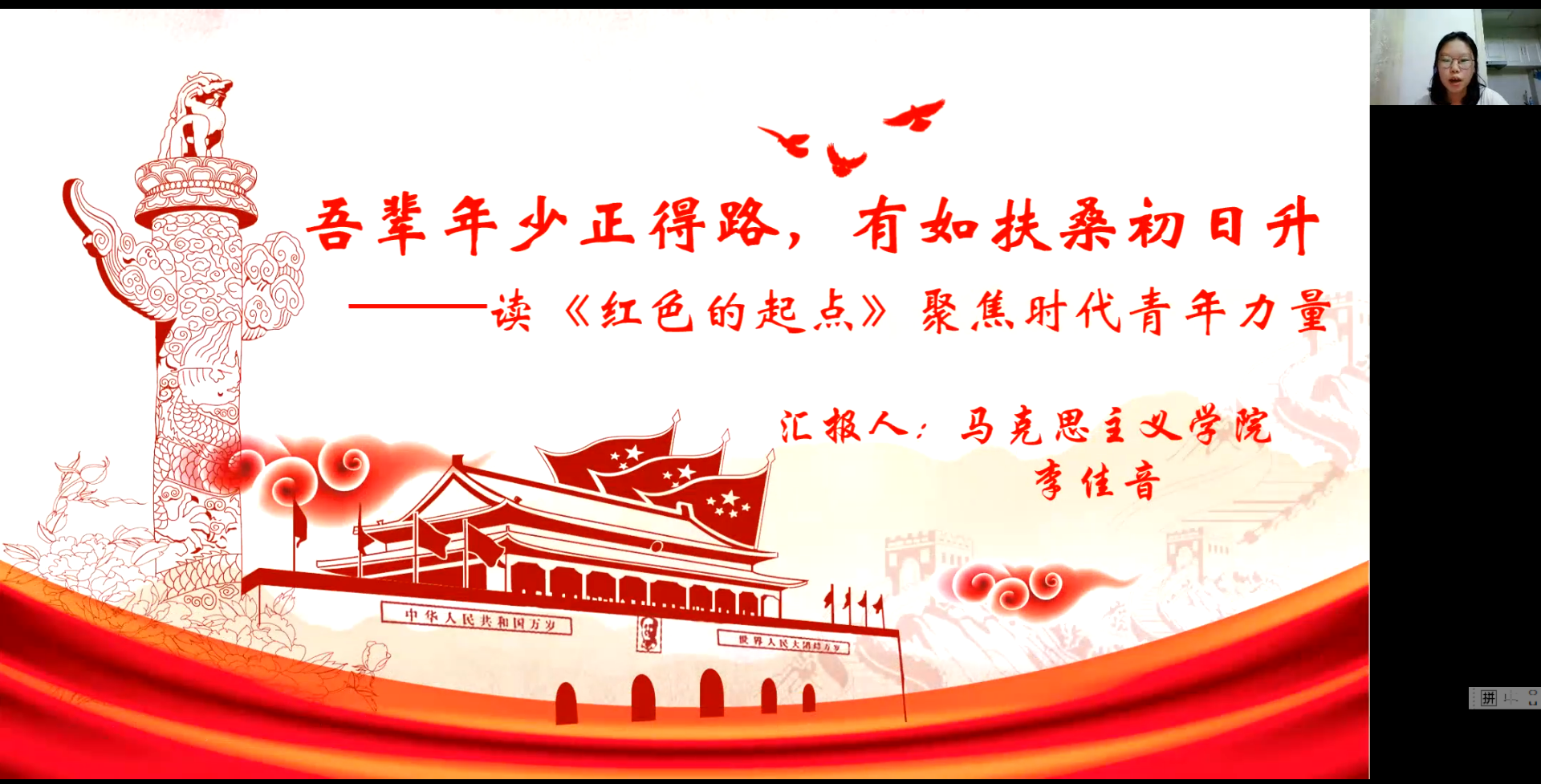 马克思主义学院李佳音同学分享的主题是“吾辈年少正得路,有如扶桑初日升”。她首先对所读书籍做简要概述;然后分享个人阅读感想,她号召大家学习革命先烈有始有终、不畏艰难、心系家国、敢攀高峰的优秀品质。