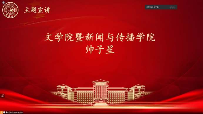 来自文学院暨新闻与传播学院的帅子星同学和大家分享了自己阅读《习近平与大学生朋友》这本书的感悟。“桃李不言、下自成蹊”,习近平总书记和青年学子之间的交集和沟通,提升了青年学子自身的涵养与担当,引导他们走出了一条条通向社会主义现代化强国的道路。时至今日,伴随着《习近平与大学生朋友》这本书一起走来的,是血脉的传承,也是学习的动力。