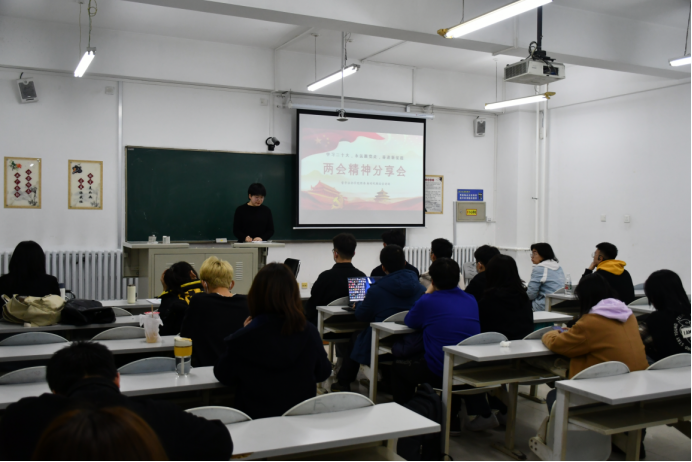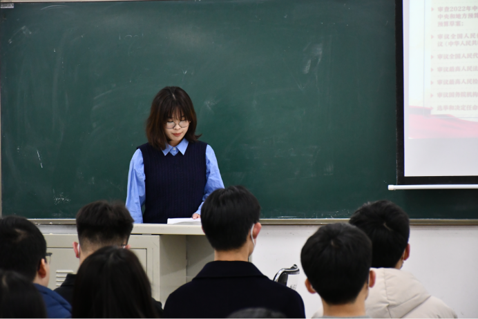 在全面贯彻党的二十大精神的开局之年,十四届全国人大一次会议、全国政协十四届次会议完成各项议程,圆满落下帷幕。习近平总书记在十四届全国人大一次会议闭幕会上发表重要讲话。为引导青年学生学习党的理论知识,坚定理想信念、厚植爱党爱国情怀,2022年3月22日晚,哲学社会学院团委新时代理论宣讲团在第三教学楼105教室召开了两会精神主题学习分享会。本次分享会由团委新时代理论宣讲团负责人郭毅同学担任主持人,21级、22级各团支部团员参加。