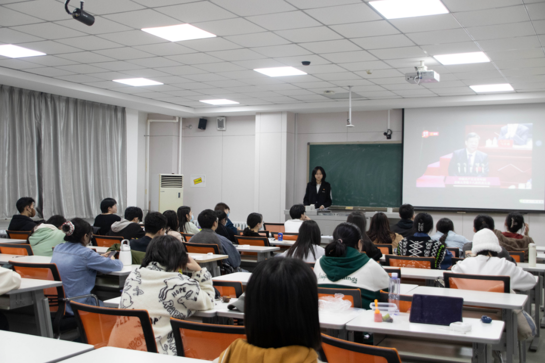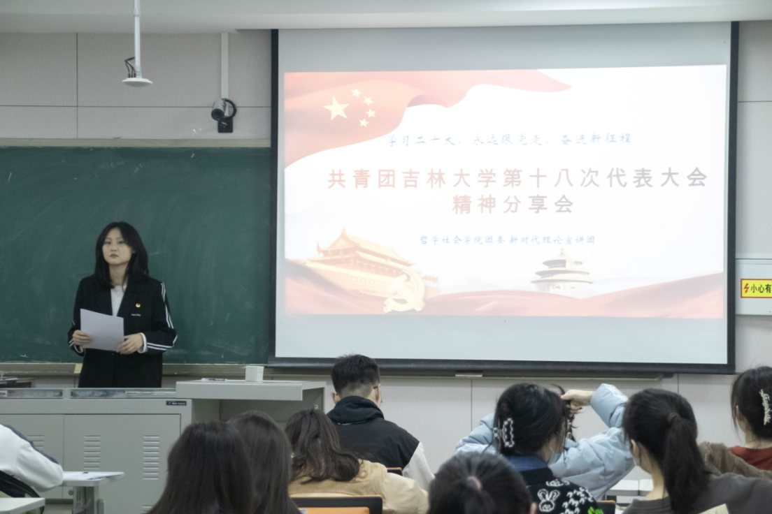 中国共产主义青年团吉林大学第十八次代表大会(以下简称“团代会”)于4月8日在我校隆重召开。为引导我院青年学生坚定理想信念,厚植爱党爱国情怀,认真学习贯彻党的二十大精神和习近平总书记关于青年工作的重要论述,深刻了解本次学校团代会的精神,4月12日晚,哲学社会学院团委在第三教学楼103教室召开了团代会主题心得分享会。本次分享会由团委新时代理论宣讲团学生负责人裴璐晓同学主持,学院团委负责人宋绍伟老师和我院各年级各团支部团员共同参加此次活动。