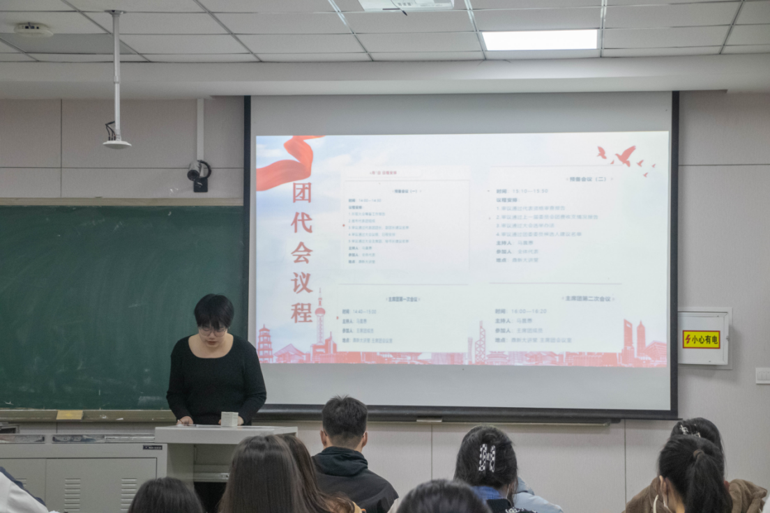 首先,主持人裴璐晓同学通过视频形式引导同学们了解了团代会的举办频次、团代会代表的选拔流程等关于团代会的基本知识,也使得同学们更加明确了我校共青团召开此次团代会的必要性。