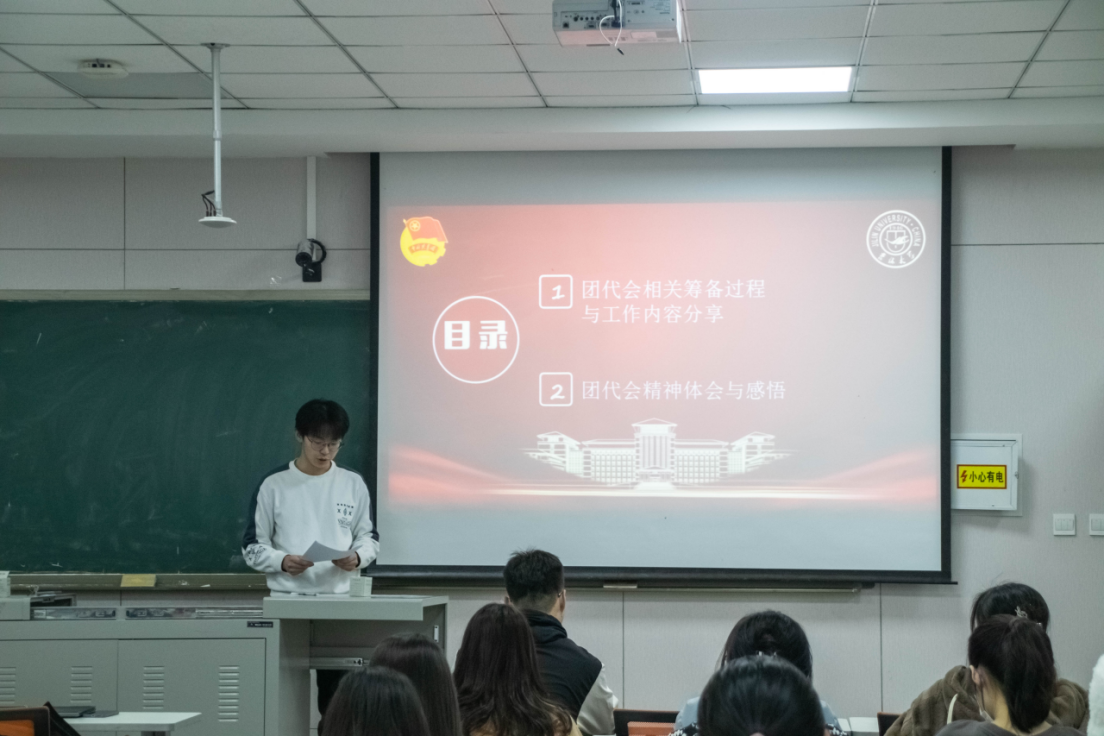 然后,由我院2022级本科生张惠侠同学进行心得分享。作为团代会的一名工作人员,他向同学们简要介绍了团代会的整体筹备过程,表达了对积极筹备、辛勤付出的全体团代会工作人员的诚挚感谢。而后,他向同学们分享了我校党委书记姜治莹老师的讲话精神,呼吁大家永怀爱党爱国的赤忱担当和敢拼敢闯的创新意识,心怀国之大者,努力成为有理想、敢担当、能吃苦、肯奋斗的新时代吉大好青年。
