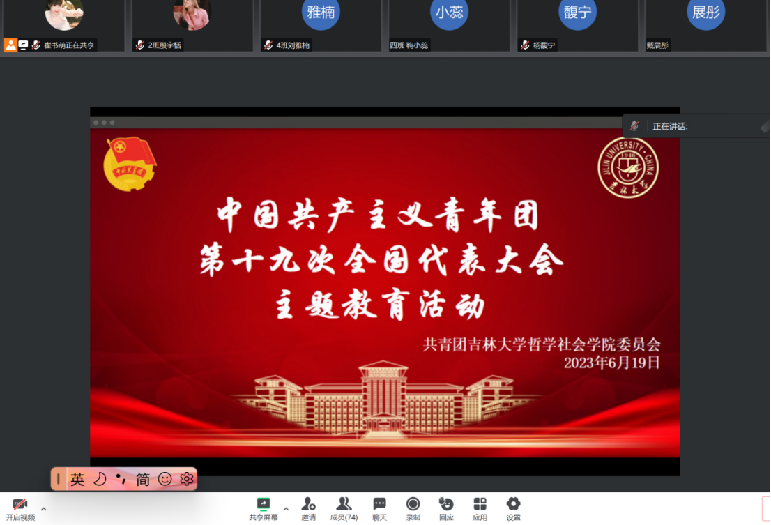 2023年6月19日上午9时,中国共产主义青年团第十九次全国代表大会在北京召开。哲学社会学院组织广大师生齐聚线上,开展“青春心向党,奋进新征程”主题学习活动。