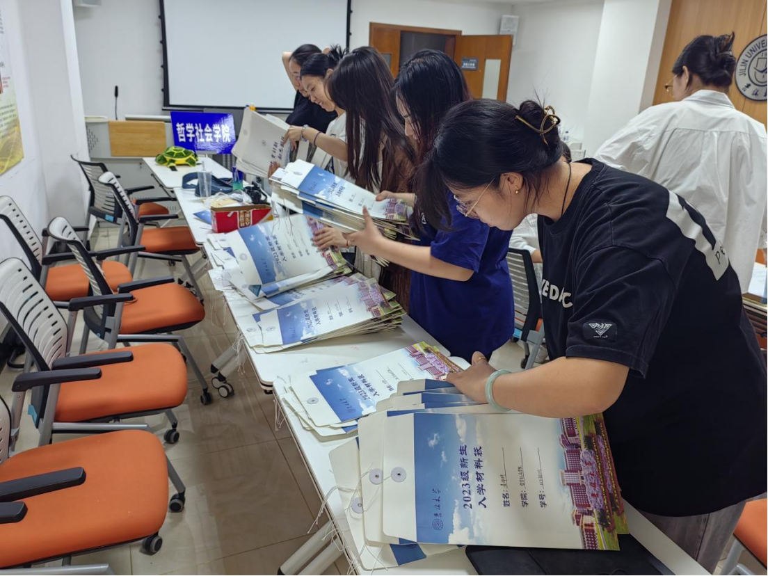 首先,根据有关通知,小组成员分批次前往各部门领取需要分发给新生的报到材料。结合我院新生人数较多,报到时间相对固定的实际情况,宋老师和同学们将领取的材料进行有效分类整理,并按照门类列出清单,逐一核对放入新生报到时领取的材料袋中。