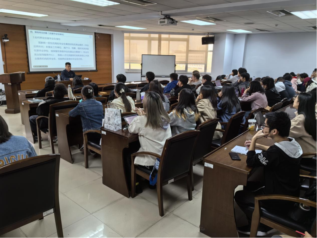 讲座伊始,安俊达老师通过网上就业平台系统实机演示了注册和信息维护、签约和解约、毕业去向确认登记、常见问题、业务办理和系统操作六方面的详细内容,从“哪些毕业生需要注册”、“什么时候进行注册”、“注册时需要重点核对的信息”、“毕业生通过什么方式签约”等这些同学们最关注的问题入手进行重点说明。安老师提醒同学们,务必仔细阅读相关操作说明,信息确认无误后再进行填写,避免操作不当引发后续问题。