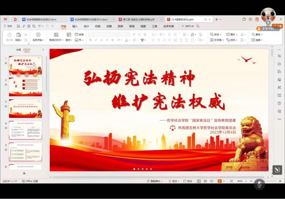 2023年12月4日晚7点,哲学社会学院团委面向2023级团员举行了一场主题为“弘扬宪法精神,维护宪法权威”的线上主题团课活动。