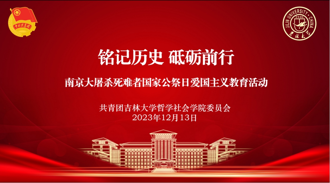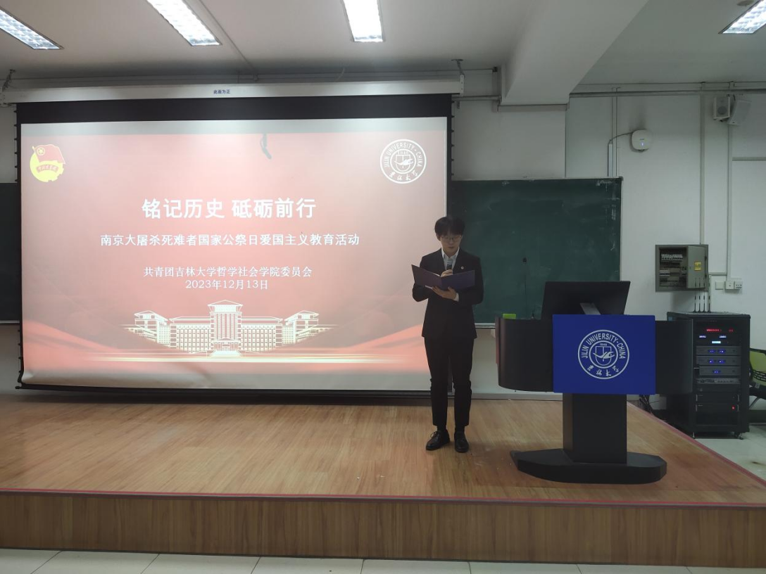 在此南京大屠杀惨案发生86周年之际,为缅怀先人,激励学院学子铭记历史、珍视和平,弘扬爱国主义精神,不忘初心、砥砺使命、淬炼品格、厚植情怀,哲学社会学院团委组织南京大屠杀死难者国家公祭日爱国主义教育活动,活动由学院2022级本科生张惠侠同学主持。