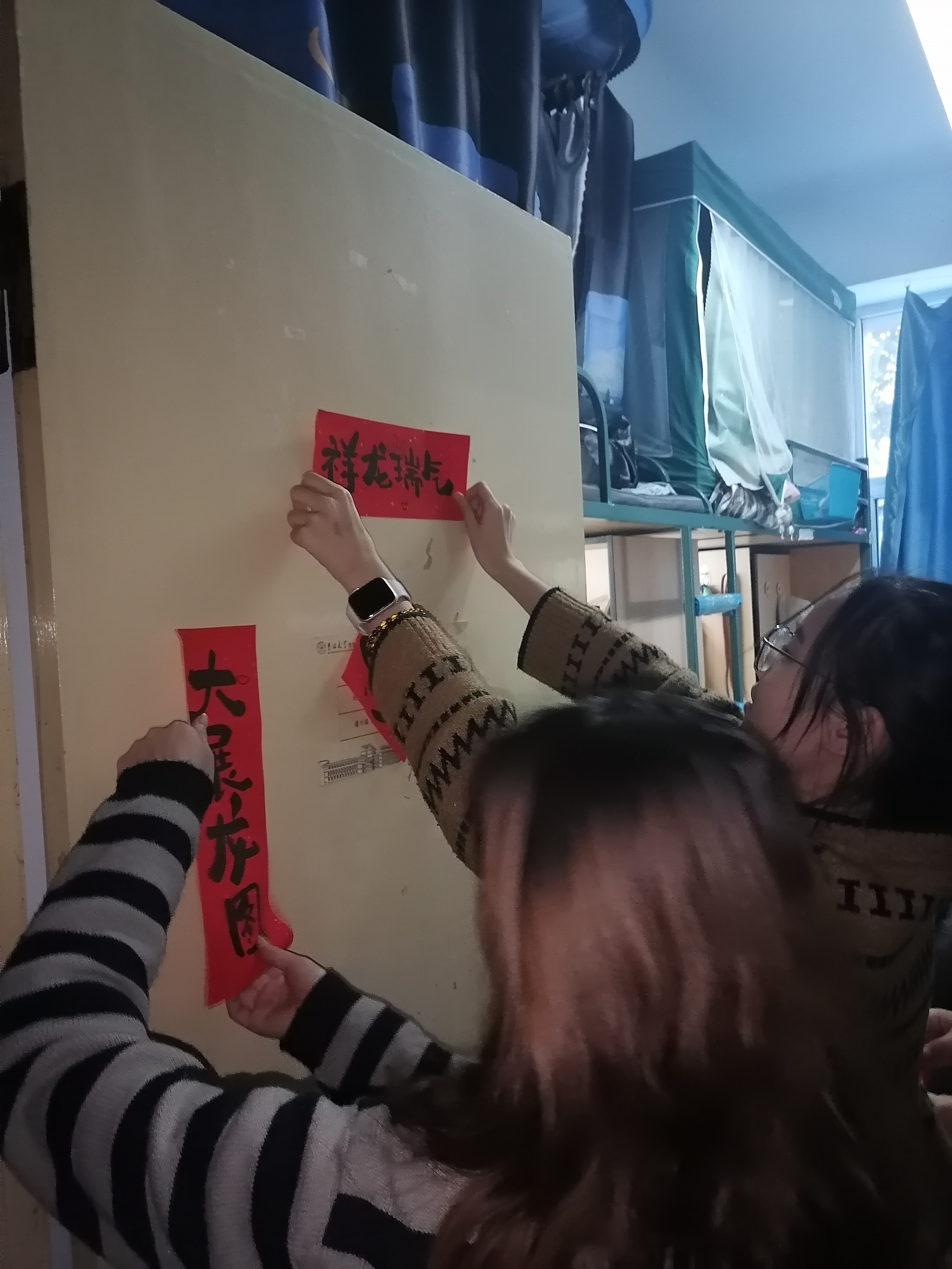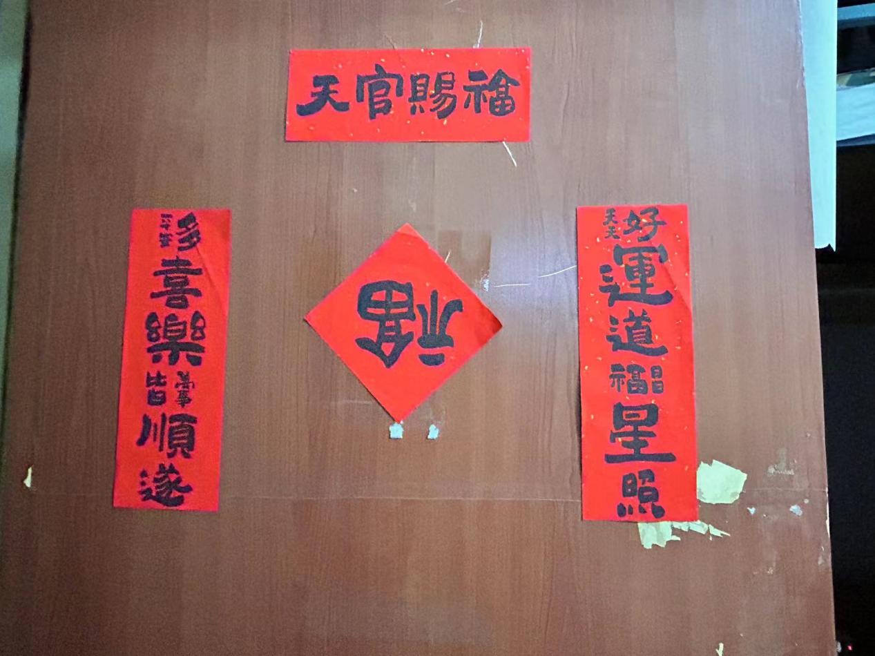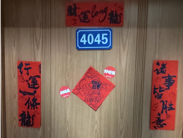 我院学生会和生活管理委员会提前购置了具有“龙”年特色的对联、福字,在各位老师的带领下,同学们纷纷动手贴上寓意着幸福美好的春联。一个个“福”字和拥有美好寓意的春联整齐地挂在门前,寝室走廊被浓郁的节日气息和喜庆的红色铺盖,浓浓的年味扑面而来。