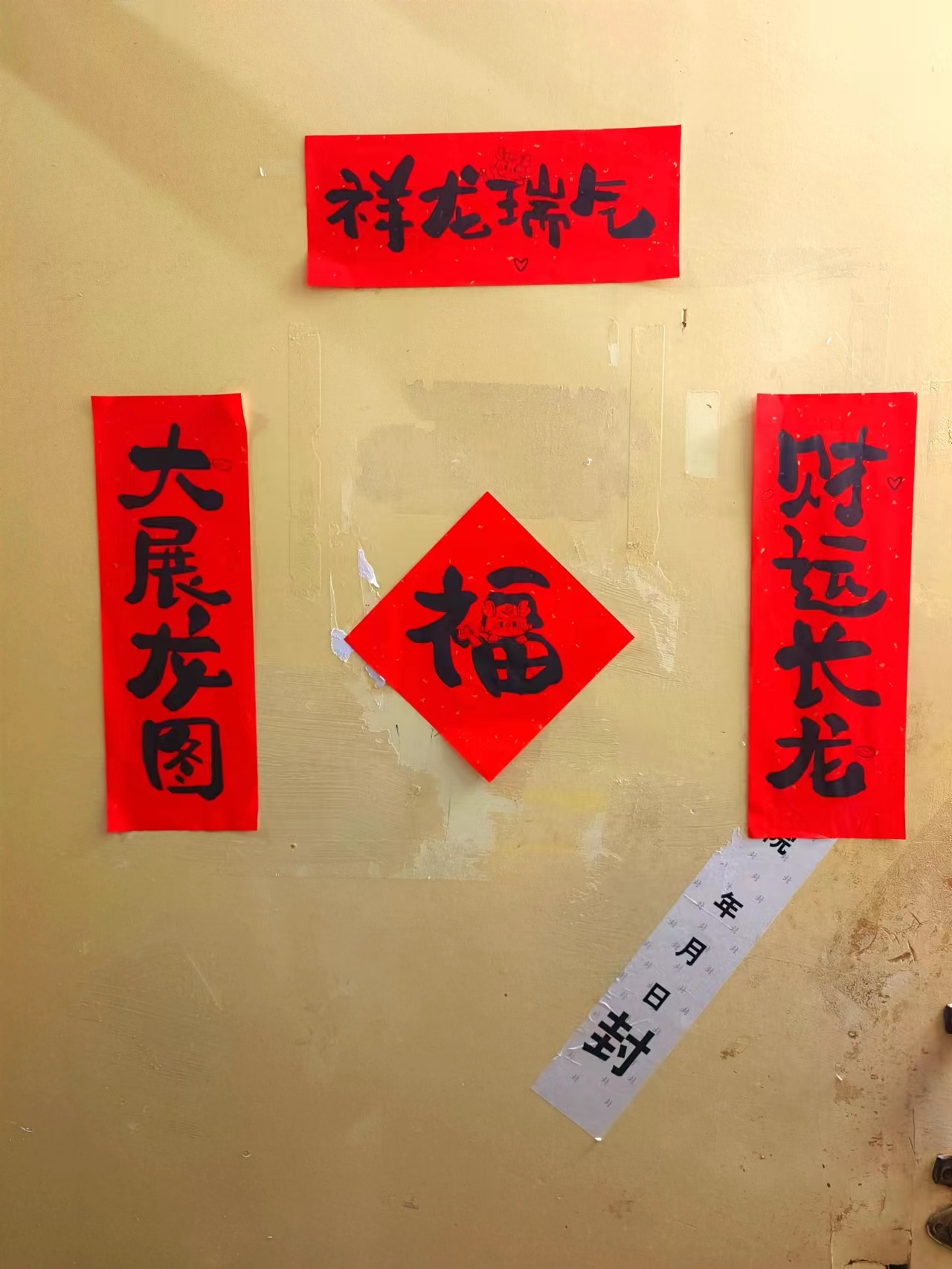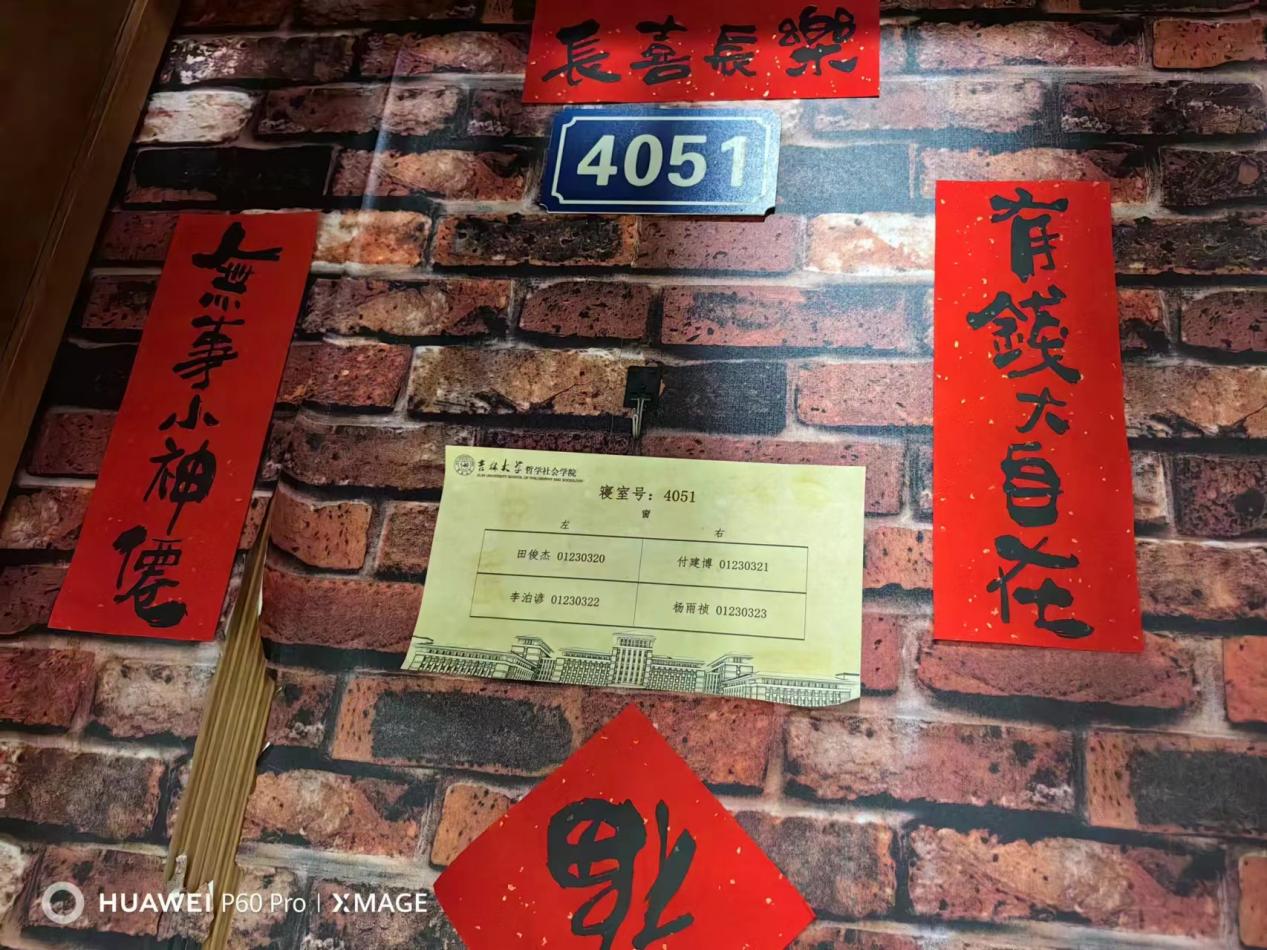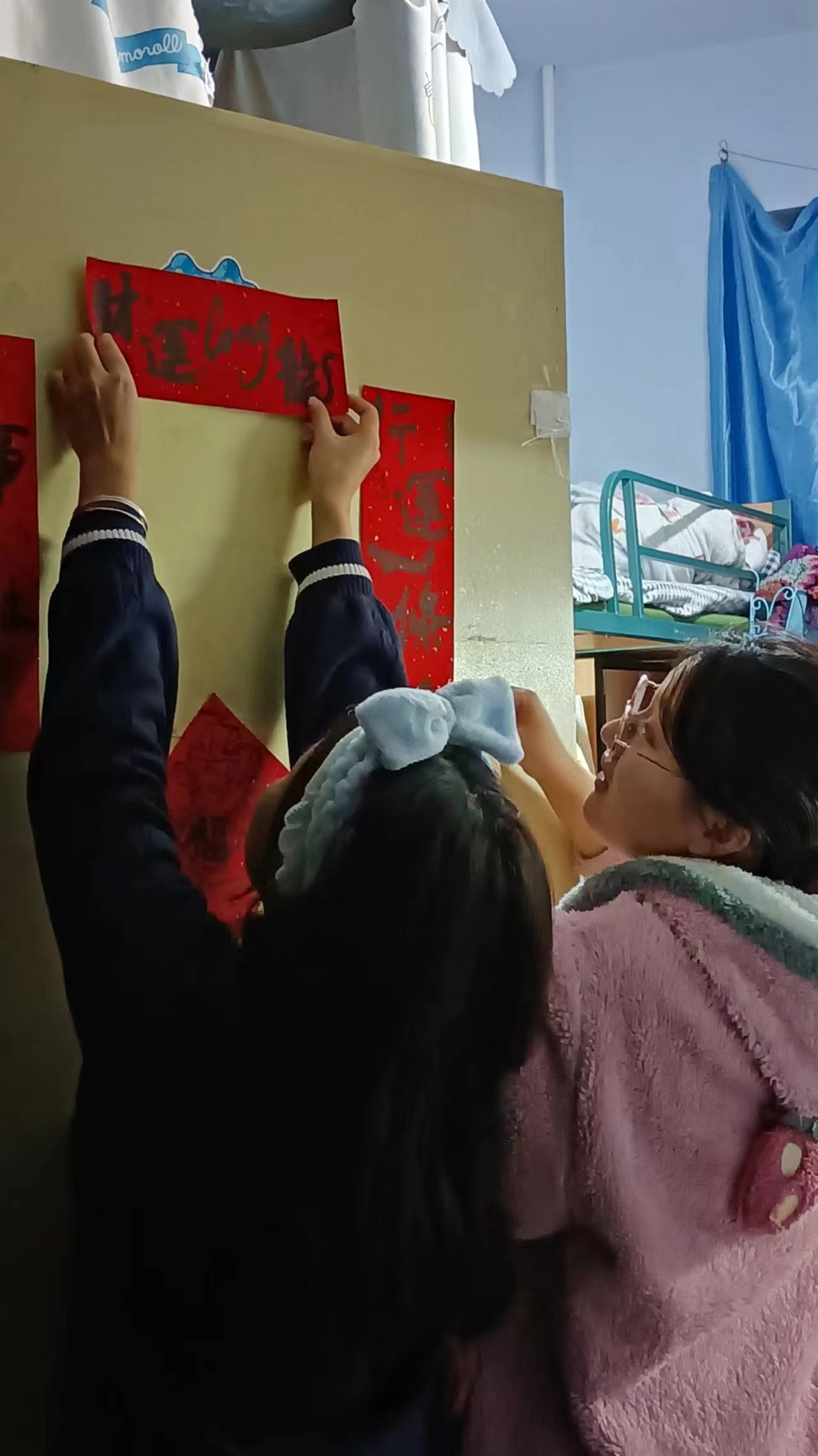 我院学生会和生活管理委员会提前购置了具有“龙”年特色的对联、福字,在各位老师的带领下,同学们纷纷动手贴上寓意着幸福美好的春联。一个个“福”字和拥有美好寓意的春联整齐地挂在门前,寝室走廊被浓郁的节日气息和喜庆的红色铺盖,浓浓的年味扑面而来。