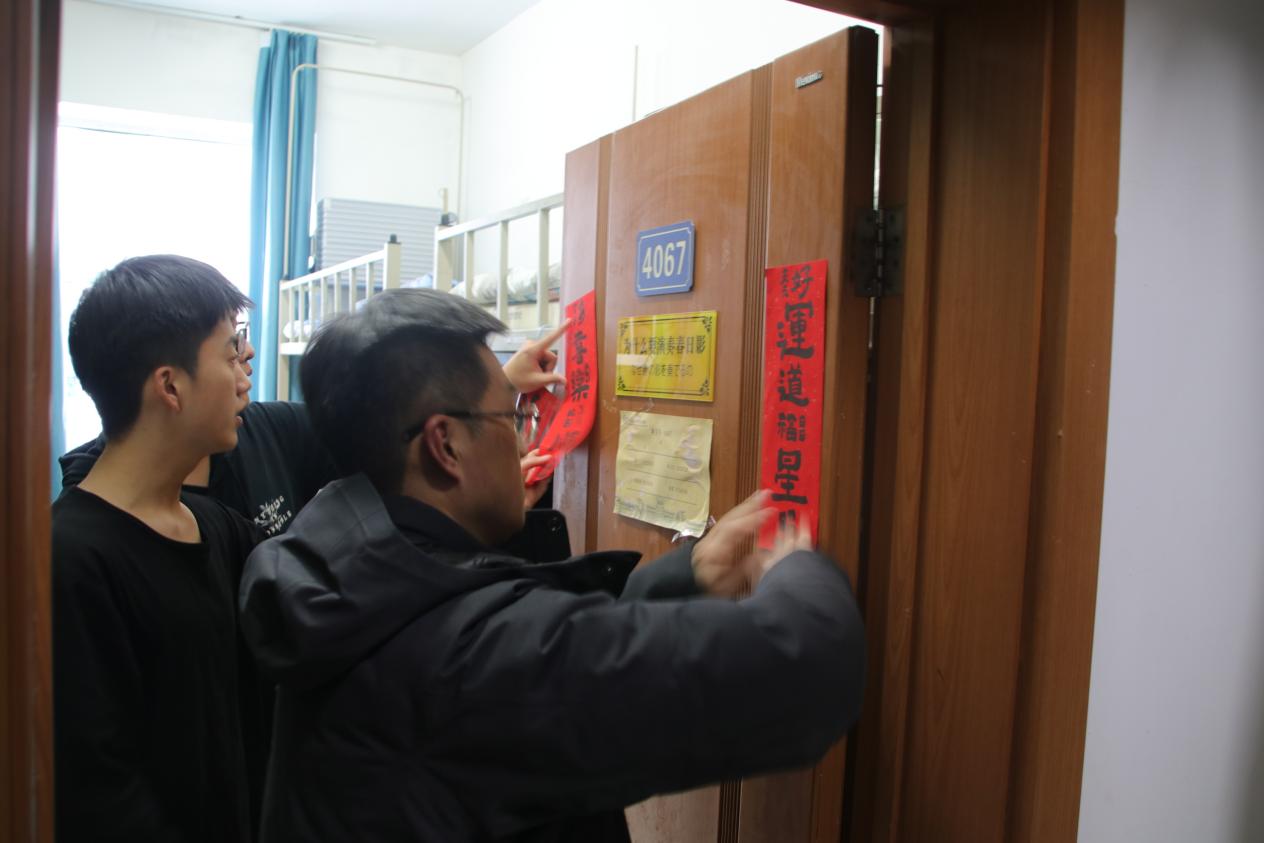 元旦假期将至,为培养学生良好的劳动实践能力和安全意识,提高学生自我管理和自我服务能力,共同营造整洁优美的公寓环境,同时深入了解本科学生期末考试复习情况,深入开展诚信教育和备考提示,12月29日,学院党委副书记兼副院长刘培强老师带队,学生工作办公室主任刘畅老师、辅导员宋绍伟老师以及学院各本科生年级主要负责同学组成工作小组,开展本科生学生寝室走访贴春联暨节前安全与诚信考试提示工作。