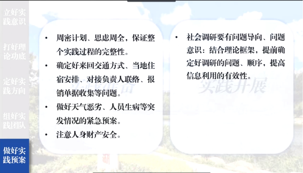 哲学社会学院劳动与社会保障专业2021级本科生房安国同学的分享则分为前提背景,经验分享,方法总结三大板块。并从个人角度出发,举例说明实践活动中常见的问题处理方式。