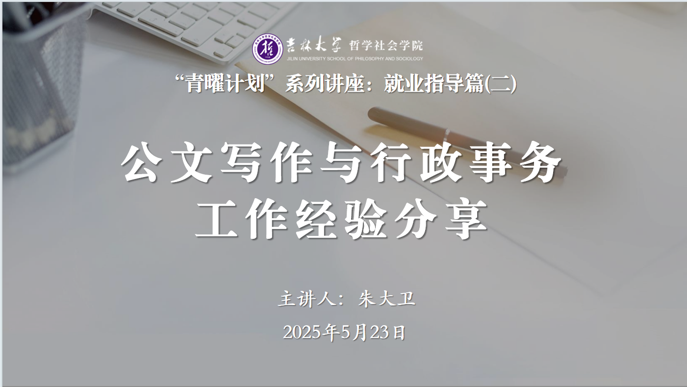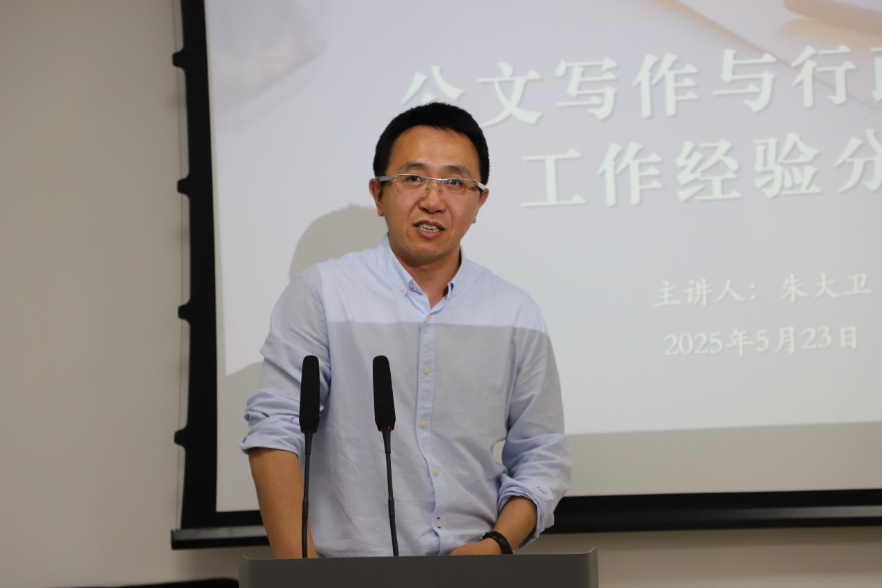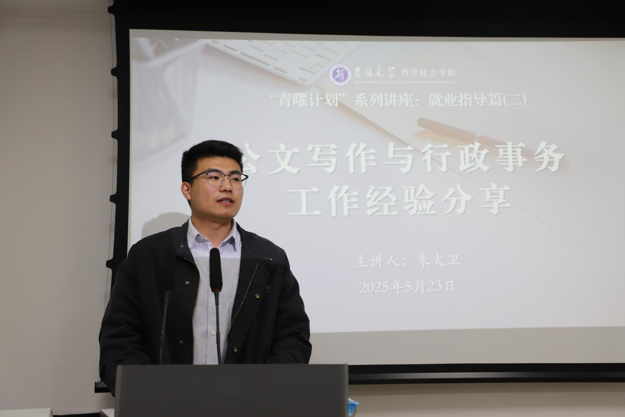 5月23日下午,哲学社会学院党委副书记兼副院长朱大卫老师围绕“公文写作与行政事务工作经验分享”主题,在东荣大厦915会议室为同学们做“青曜计划”系列讲座第二讲——就业指导篇,本次讲座由学院本科生辅导员张鑫鹏老师主持。