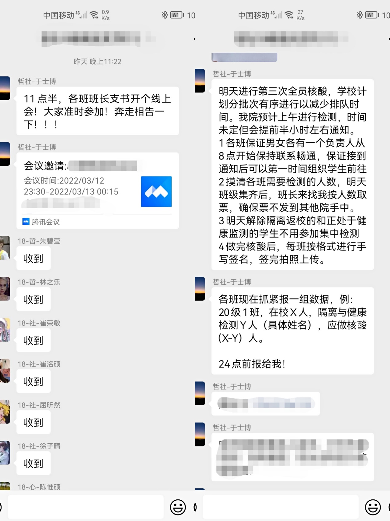 于昨日起,我院老师们积极响应学校有关工作部署,按照要求主动来到校园,入住学生公寓,倾听学生需求,及时帮助同学解决当前面临的实际问题,获得了同学们的广泛认可;面对尚不确定的疫情防控形势,各位老师与各年级各班主要学生干部、党员同学连夜开会,商讨解决办法,一系列工作任务最终精准地传达到每一位同学处,此时此刻,广大哲社学子正有序地居住在寝室中,等待学校和学院的进一步通知。