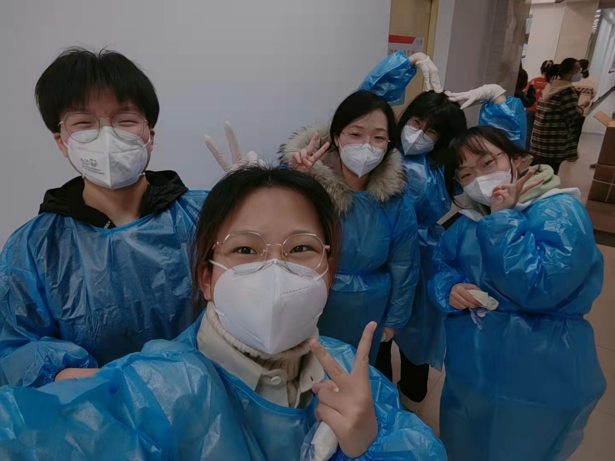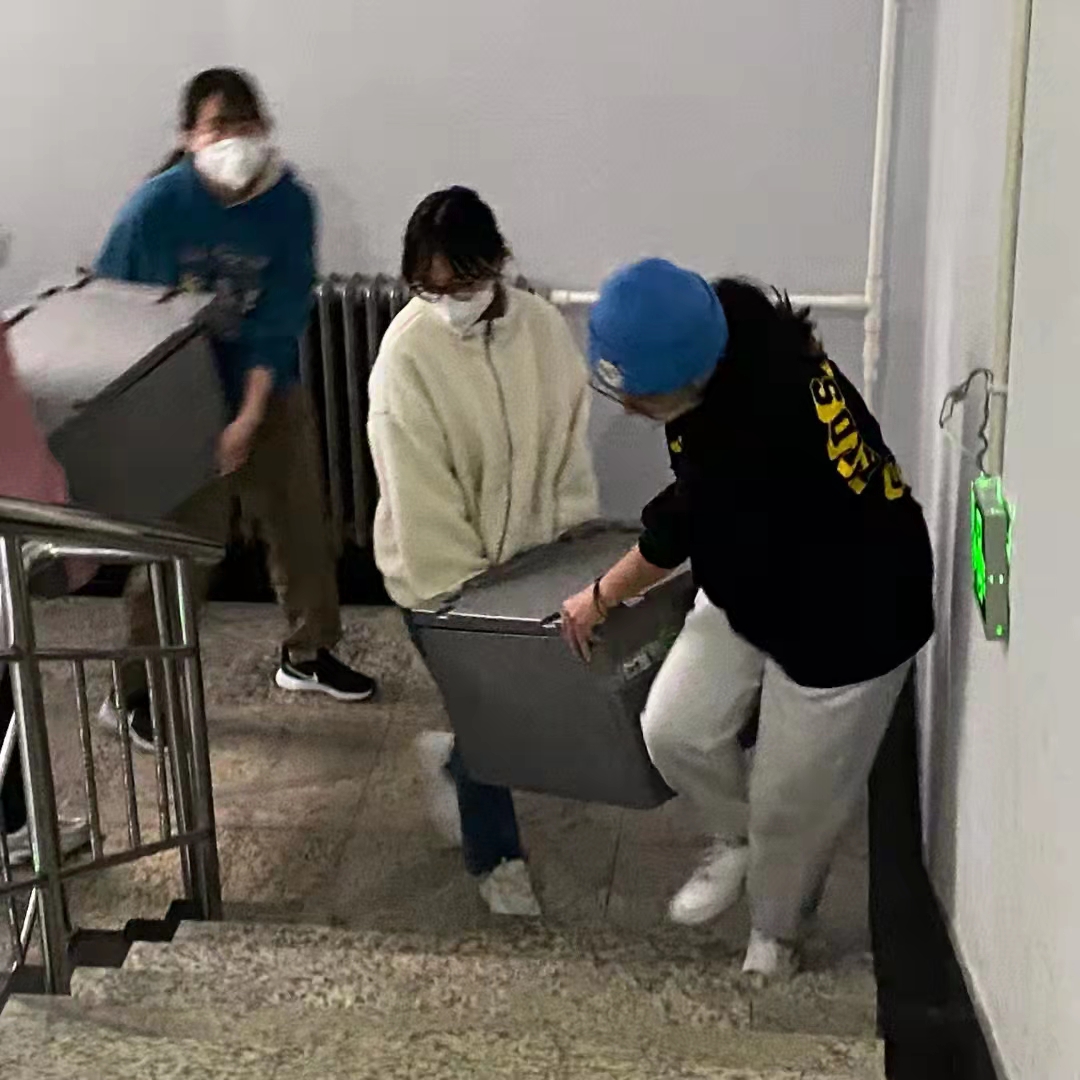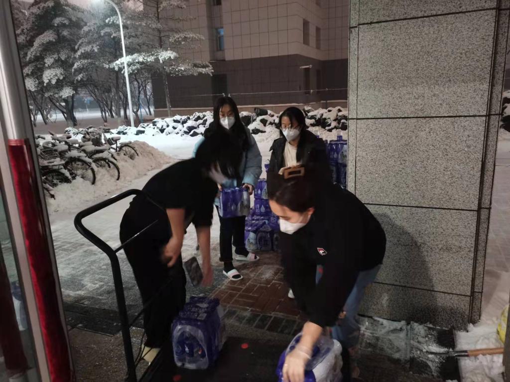 送水送餐做核酸,谁说女子不如男。接到通知后的十余分钟内,我院同学们迅速组成了一支近两百人的志愿者团队,女同学们巾帼不让须眉,瘦弱的身躯中爆发出强大的力量——几位志愿者需要搬着八个大箱子上到六楼,来回上上下下数十次——这些志愿者们一趟又一趟的忙碌,在室外零下几度的温度中,汗水打湿了衣服。在完成了自己的任务后,我院志愿者也会帮助其他学院进行防疫工作,将我院深厚的助人底蕴与人文关怀落到实处。