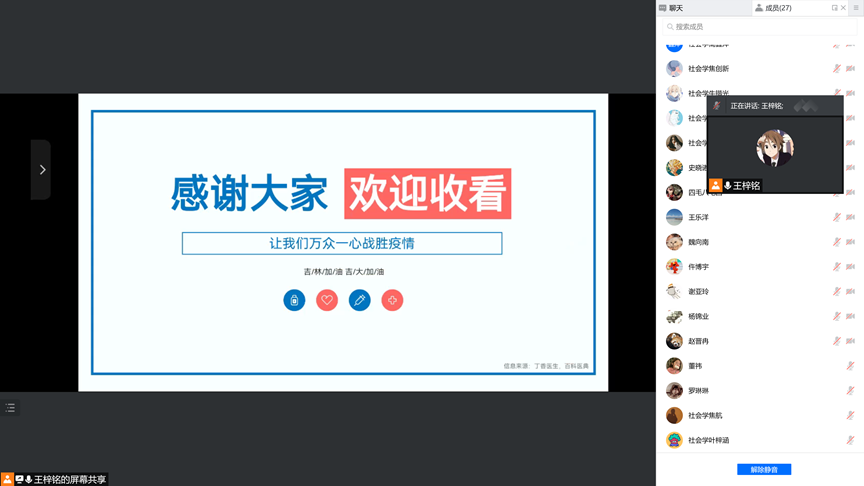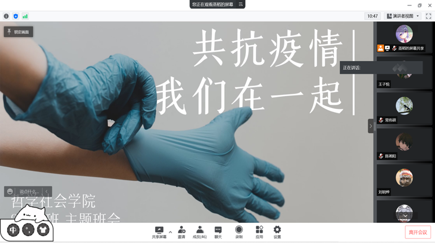 三月乍暖还寒之际,疫情来势汹汹,打乱了同学们的校园生活。目前疫情形势依旧严峻,然而,用众人之力,则无不胜也,全校师生戮力同心、众志成城,我们一定能守护我们和谐美好的吉大校园!为坚定信心、共克时艰,加强学生的思想教育和价值引领,响应学校号召,哲学社会学院开展“抗击疫情,我们在一起”疫情防控主题教育线上班会。