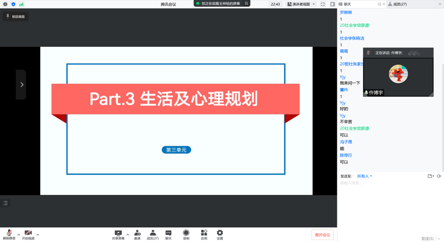 20级社会学班由王梓铭、曾辞源、仵博宇同学主持开展主题班会,王梓铭同学为同学们分析了当前面临的疫情形势,鼓励大家在做好防护措施的同时,积极加强锻炼、增强免疫力,保持积极向上的生活状态;曾辞源同学讲述了疫情下线上学习的要点,与老师积极沟通联系,以轻松认真的态度面对学习生活;仵博宇同学分享了心理排解、解压渠道给大家,为大家排忧解难,呼吁在疫情时大家保持乐观阳光的心,努力学习思政知识、武装自己。会上,同学们积极参与,张家仪、孙映雪同学分享了自己在校园抗击疫情时的感受和切身体会,同学们感触颇深。
