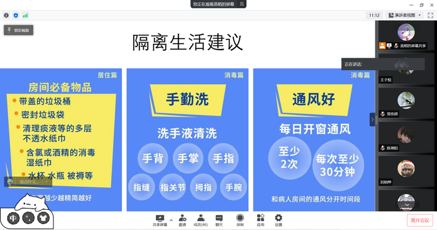 哲学社会学院20级哲学班于15日下午组织主题班会,会上介绍了隔离生活的一些小贴士,如密封垃圾袋、常用酒精湿巾消毒、每日开窗通风等,有利于广大同学提高自我调节能力,以积极乐观的心态面对疫情,多方面丰富自己的日常生活,有条不紊地进行线上学习。随后,会议开展了意见建议收集环节,方便了解同学们的需求,收集意见建议,并及时向学院副书记、辅导员反馈汇报,保障同学们日常所需。