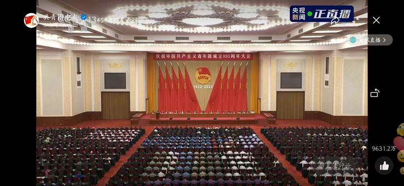 庆祝中国共产主义青年团成立100周年大会于5月10日上午10点在北京人民大会堂隆重举行。为贯彻“喜迎二十大、永远跟党走、奋进新征程”主题教育实践活动安排,哲学社会学院组织全体学生线上观看大会直播,并对习近平总书记讲话进行集中学习。